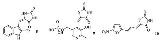 It is also known that synthetic thiohydantoin (rhodanine) analogues 8, 9, in addition to antitumor and anti-HIV activity, exhibit pronounced antibacterial properties [16], along with some hetarylidene thiazolidines containing pyridine 9 [17] and furan 10 [12,18] fragments in the side chain being beta-lactamase inhibitors (Figure 3).