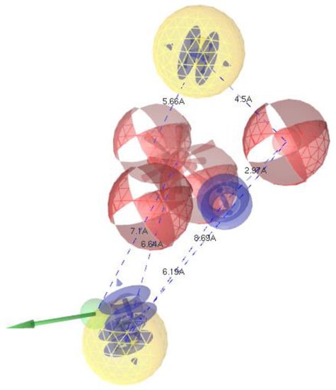 The proposed pharmacophore model of antibacterial activity (in yellow color the hydrophobic (H), red hydrogen bond acceptor (HBA), green hydrogen bond donor (HBD), red star positive ionizable (PI) and blue aromatic (AR) features).