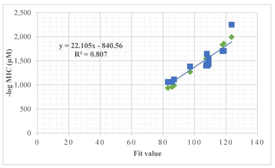−logMIC(μM) = 22.105 fitvalue–840.56, R = 0.898, R2 = 0.807
