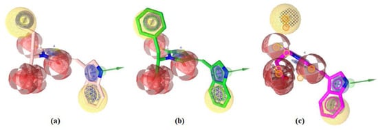 (a) Best aligned pose of compound 1 (MIC 0.56 μM × 10−2) superposed with model-1. (b) Best aligned pose of compound 2 (MIC 1.96 μM × 10−2). (c) Best aligned pose of compound 14 (MIC 8.66 μM × 10−2).