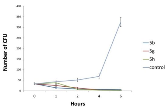 Application of the selected compounds has significantly reduced the number of viable P. aeruginosa colonies (Figure 7). After 2 h of application, the number of viable P. aeruginosa colonies was reduced for more than 84% (5b and 5h) and more than 74% (5g). All of the examined compounds, after 6h of treatment, reduced the number of P. aeruginosa CFU by more than 98%.