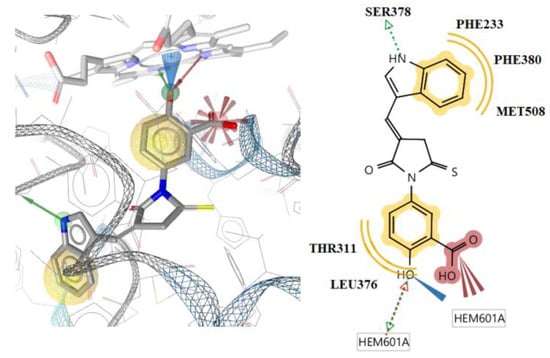 The best aligned poses of the most active compounds 1 and 2 and the less active 14, superposed with model-1, are presented in Figure 6. As is obvious, some structural features play a key role for the activity. The 1H-indole moiety is thought to be critical for activity. Additionally, the absence of hydrophobic groups can partially explain their lack of activity. The other features that are common for all compounds are three HBA features and the positive ionizable interaction of carboxyl group.