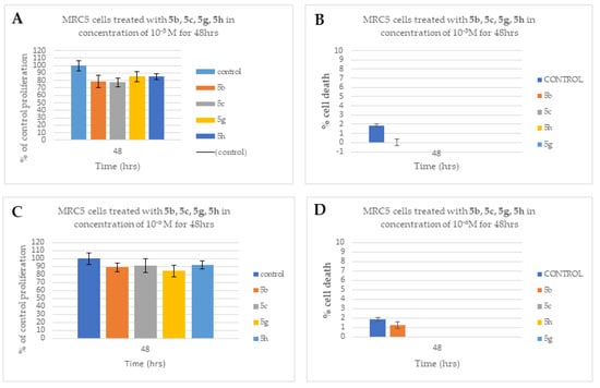The normal human lung fibroblast MRC-5 cell line is stored and used in our laboratory in a routine manner (passage < 40). MRC-5 cells were grown in culture (37 °C, humidified atmosphere containing 5% v/v CO2) in DMEM medium supplemented with 10% v/v FBS, 1% PS penicillin–streptomycin). The compounds tested were dissolved in DMSO and stored in 4 °C. For the assessment of cytotoxicity, the cells were seeded in a 96-well plate at an initial concentration of 5 × 104 cells/mL and allowed to attach for at least 3h before the addition of the compounds at two different concentrations: 1 × 10−5 M (10 μΜ) and 1 × 10−6 M (1 μΜ). Note that the concentration of DMSO in culture was ≤0.2% v/v, in which no detectable effect on cell proliferation is observed [67]. To assess the cytotoxicity of each compound, the cells were allowed to grow for additional 48 h before their number is estimated in culture using the Neubauer counting chamber under an optical microscope. Cell growth in each treated culture is expressed as the percentage compared to that seen for the untreated control cells. Moreover, the number of dead cells was also measured using the Trypan-blue method, as previously described [65,66,67]. Statistical t-test analysis was performed via the use of GraphPad Prism 6.0 program.