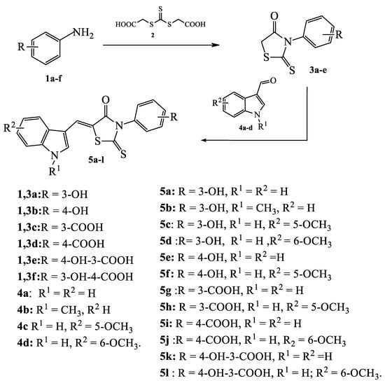 The starting materials for the synthesis of the described products were 3-aryl-2-thioxothiazolidin-4-ones 3a–e. They were obtained by the reaction of aromatic amines 1a–e with bis (carboxymethyl) trithiocarbonate 2 (Scheme 1). In the second step, the 3-aryl-2-thioxothiazolidin-4-ones further undergo Knovenagel condensation with 1H-indole-carbaldehyde to give the title compounds 5a–l. We used the optimized procedure to do this; the details of the procedure are given in Table 1. Unfortunately, we were not able to obtain 2-hydroxy-4-(4-oxo-2-thioxo-thiazolidin-3-yl)-benzoic acid 3f using 4-amino-2-hydroxybenzoic acid as the starting material 1f, since spontaneous decarboxylation with the formation of 3a occurred under the reaction conditions.