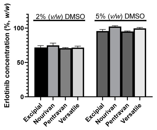 During the preliminary studies, the only formulations which kept sufficient amounts of ERL were those prepared by the use of DMSO, i.e., the formulation including the highest quantity of DMSO. This result may be explained by the fact that ERL is sensitive to oxidative degradation as highlighted by the stress testing study (Table 1 and Figure S3), and that DMSO reduces the risk of oxidation [16]. Further, for a given amount of DMSO (i.e., 2% or 5% v/w) the highest assay results for ERL were always obtained with Nourivan Antiox®, confirming that using an environment protecting ERL from oxidation may be necessary to keep the ERL amount at the appropriate level.