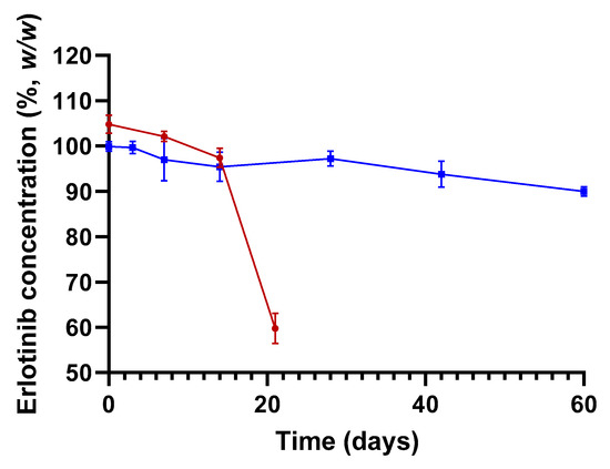 Without pH change of the blend (pH ~ 3.5), after 21 days, the mean assay of ERL was 57.0 ± 3.2% (Figure 3).