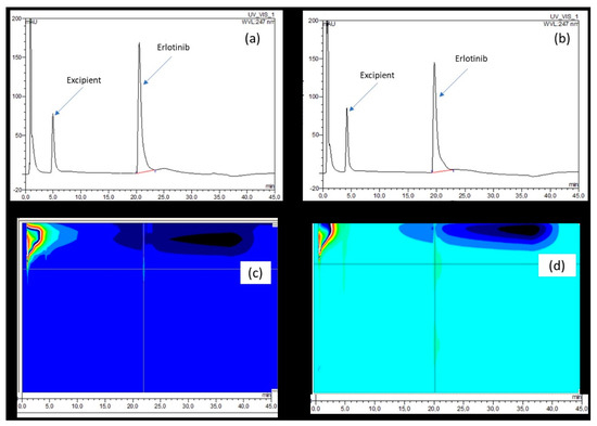 Typical chromatograms recorded at 247 nm on the day (a) and 42 days after preparation (b) and the corresponding 3D chromatograms (c,d) recorded from 200 to 800 nm.