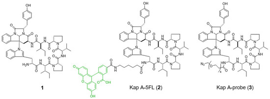 The following supporting information can be downloaded. Figure S1: HRESIMS (neg.) of Kap A-probe (3), Figure S2: 1H NMR spectrum (600 MHz, methanol-d4) of Kap A-probe (3), Figure S3: HPLC chart of Kap A-probe (3).