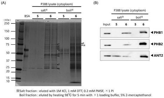 After separation of the protein bands by SDS-PAGE, the gel was fixed in 100% MeOH. The gel was then immersed in transfer buffer (tris-hydroxyaminomethane 25 mM, glycine 192 mM, 20% MeOH) and the proteins in the gel were transferred to a polyvinylidene fluoride (PVDF) membrane using a transfer system at a constant current of 180 mA for 60 min. The transferred membranes were fixed and stained with Ponceau stain and then decolorized. Blocking was then carried out using 10% skim milk powder dissolved in TBS-T for 60 min at room temperature. Then, primary antibodies anti-prohibitin 1 (1:100, sc-377037, Santa Cruz Biotechnology, Inc., Dallas, TX, USA), anti-prohibitin 2 (1:100, sc-133094; Santa Cruz Biotechnology, Inc., Dallas, TX, USA), and anti-ANT2 (1:1000, ANT2/SLC25A5(E2B9D), Cell Signaling Technology, Danvers, MA, USA), diluted in PBS-T solution containing 1% skim milk, were allowed to react overnight at 4 °C. Shaking and washing with PBS-T for 5 min was performed three times; then, the antibodies were reacted with secondary antibodies for 3 h at room temperature. After 3 rounds of shaking and washing with PBS-T for 5 min, protein detection was performed using SuperSignal West Pico Chemiluminescent Substrate or Super Signal West Femto Maximum Sensitivity Substrate (Bio-Rad, Hercules, CA, USA). An LAS-3000 (FUJIFILM, Tokyo, Japan) was used to photograph the membrane.