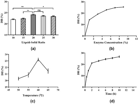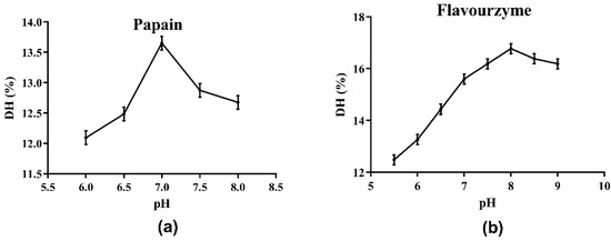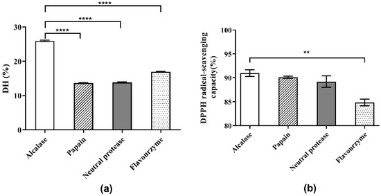 - Noman, A.; Xu, Y.; Al-Bukhaiti, W.Q.; Abed, S.M.; Ali, A.H.; Ramadhan, A.H.; Xia, W. Influence of enzymatic hydrolysis conditions on the degree of hydrolysis and functional properties of protein hydrolysate obtained from Chinese sturgeon (Acipenser sinensis) by using papain enzyme. Process Biochem. 2018, 67, 19–28. [Google Scholar] [CrossRef]