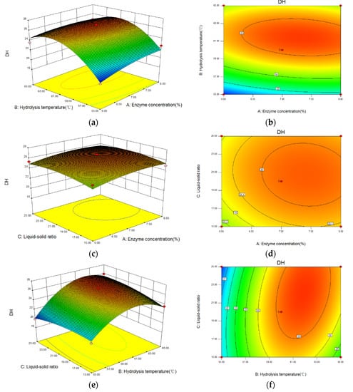 3.4. Optimization of Enzymatic Hydrolysis with DH as Response Value by RSM