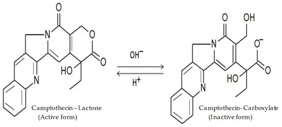 Camptothecin (CPT) is a naturally occurring quinolone alkaloid found in the bark of Camptotheca acuminata and members of the genus Nothapodytes [1]. CPT inhibits DNA topoisomerase I via non-covalent interactions, which inhibit the growth of several tumour types. Various studies have revealed that the lactone ring of CPT is essential for its antitumour activity [2]. However, two major drawbacks are related to the efficacy of CPT: its poor solubility in water and the instability of the lactone moiety (Figure 1). Within the physiological environment, the lactone ring is converted to its carboxylate form via a pH-dependent reaction, thereby making the drug less active, highly toxic, and poorly bioavailable [3]. Several approaches have been tested to increase the drug’s solubility and stability. Some of them involve the use of polymeric microspheres, liposomes, micro-emulsions, and the formation of inclusion complexes with cyclodextrin. Thus far, these methods have yielded some success. In particular, liposomes containing a polyethylene glycol (PEG) shell for the injectable delivery of CPT have shown promising results.