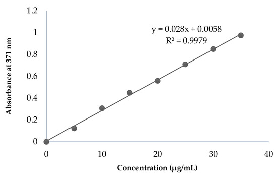 The λmax of CPT was found to be 371 nm, which was selected for further analysis. The range of linearity was identified between drug concentrations of 5 and 35 µg/mL CPT (Figure 2).