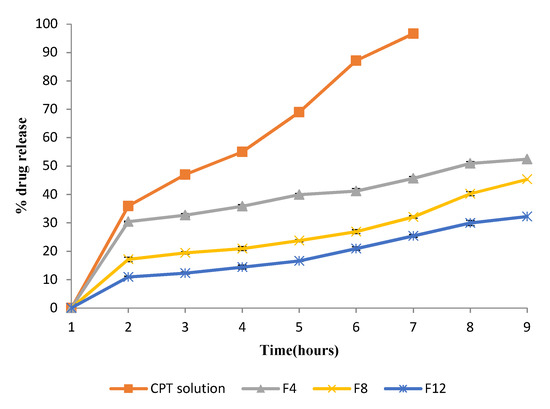 In vitro drug release from CPT liposomal formulations (F4, F8, F12). Values are expressed as means ± SD.
