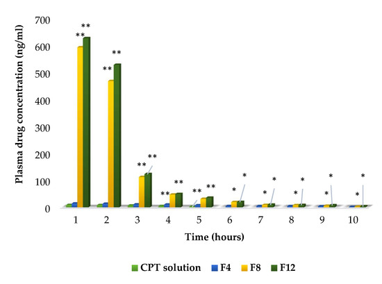 Plasma drug concentrations of CPT drug solution, conventional (F4), and PEGylated (F8, F12) liposomes (in vivo pharmacokinetic study). Note: ** denotes p < 0.01, * denotes p < 0.05 when compared with CPT solution (ANOVA followed by post hoc Dunnett’s test).