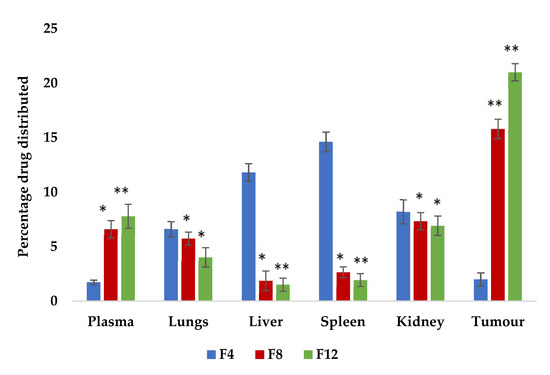 CPT tissue distribution in mice bearing EAC cells 24 h after i.v. injection of CPT-loaded PEGylated liposomes (F8 and F12) at a dose of 2.5 mg/kg. Each value represents the mean ± SD (n = 3), ** p < 0.01, * p < 0.05 compared with conventional liposome formulation (F4) (one-way ANOVA followed by post hoc Dunnett’s test).