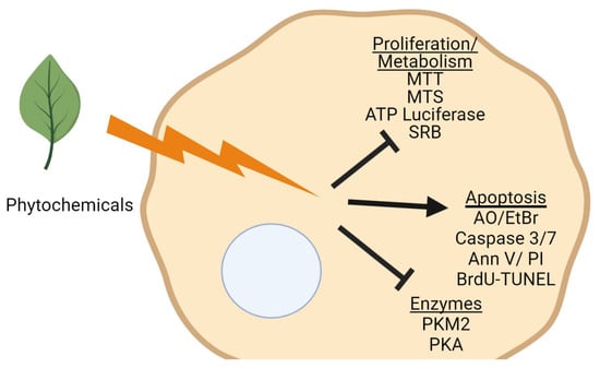 Anti-cancer bioassays to assess in vitro cellular effects of phytochemicals. The inherent antioxidant activities of phytochemicals may elicit anti-tumorigenic effects through either the inhibition of proliferation/cell metabolism, induction of cell apoptosis, or the inhibition of cancer associated enzymes. Assays to assess each cellular function are listed below each underlined function. MTT: 3(4, 5-dimethylthiazol-2-yl)-2, 5-diphenyltetrazolium bromide; MTS: 3-(4, 5-dimethylthiazol-2-yl)-5-(3-carboxymethoxyphenyl)-2-(4-sulfophenyl)-2H-tetrazolium; SRB: sulforhodamine B; AO/EtBr: Acridine orange/ethidium bromide; Ann V/PI: Annexin V/Propidium Iodide; BrdU-TUNEL: bromodeoxyuridine-Terminal deoxynucleotidyl transferase-mediated d-UTP nick end labeling; PKM2: pyruvate kinase M2; PKA: protein kinase A. (Created with BioRender.com.)