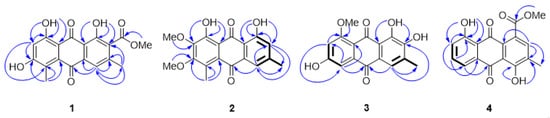 The key HMBC (arrow line) and COSY (bold line) correlations of compounds 1–4.