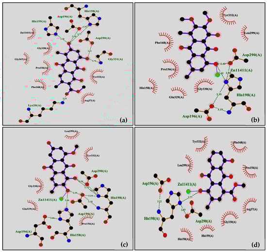 Binding interactions of the isolated compounds docked into HDAC4 template with hydrogen-bonds (dash bond): (a) compound 1; (b) compound 2; (c) compound 3; (d) compound 4.