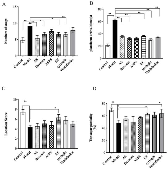 Figure 1A clearly showed that all groups except for the control group were influenced by radiation, and compared to the model group, the number of snags in AS group (p < 0.01), flavones group (p < 0.05), syringin group (p < 0.01) and EE group (p < 0.05) significantly decreased. But the ASPS and Venlafaxine had no significant difference compared with the model group (p > 0.05). Meanwhile, All drug-treatment groups had a significantly reduced total time of arrival to the platform (Figure 1B, p < 0.01). It demonstrated that the functional components of Acanthopanax senticosus selected in this experiment can improve the spatial memory ability of brain-injured mice induced by radiation. Further more, the surcrose preference test reflected the anhedonia of mice. As can be seen from Figure 1D, the sugar partiality of the ASPS group, EE group, syringin group and positive control group was, respectively, 58.04%, 63.02%, 61.62% and 60.72%, which were extremely significant compared with the model group (p < 0.01).