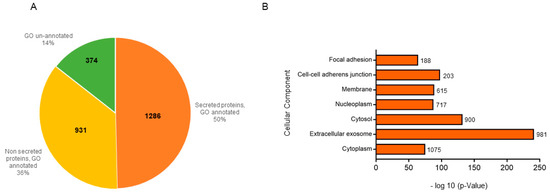(A) Pie-chart of PD cellular component annotation of proteins identified in two secretome samples. (B) GO annotation of the cellular component terms of all the identified proteins vs. their p-values, performed using the DAVID database and the full Homo sapiens proteome as a background. For each term, the corresponding protein count is reported next to the bar.