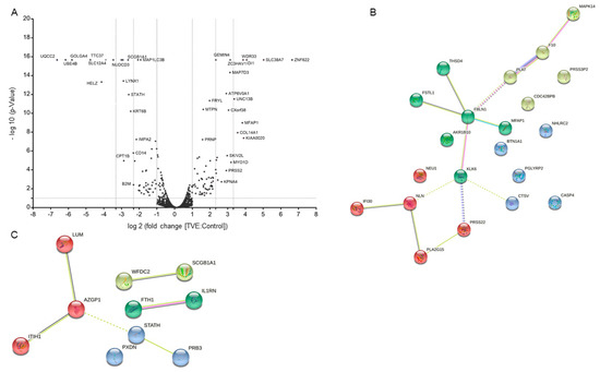 In total, we identified 2693 proteins. Of these, 2511 were common between untreated and treated samples (Figure S1) and we focused on high-confidence 2529 proteins, identified by an FDR less than 5%. All of these proteins were also quantified (Supplementary Materials Table S1). Then, the ones quantified in TVE vs. control experiments were compared (Figure 4A) and those proteins with a fold change ≥2 or ≤0.5 (ratio of TVE vs. ctr) and with a p-value ≤0.1 in 3 out of 3 experiments were considered as significantly up- and down-regulated. This resulted in 153 significantly up-regulated proteins (i.e., 6.1% of the total) and 72 less abundant ones (i.e., 2.9% of the total). We then focused on the proteins whose Gene Ontology “Cellular Component” annotation reported “extracellular” as a key word (Table 1) and, to cluster them, we exploited the kmeans clustering approach of the web tool STRING [13]. The obtained results are shown in Figure 4B (more abundant proteins) and Figure 4C (less abundant proteins).