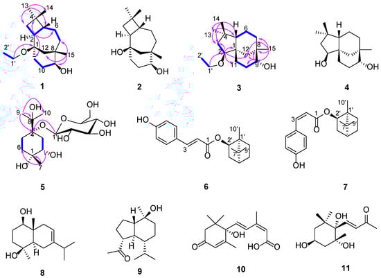 The structure of compounds 1–11; Selected HMBC (→) and 1H-1H COSY (▬) correlations of 1, 3 and 5.