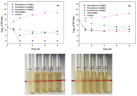 Time-dependent killing of MRSA-3 by compound 6. (a,c) MASA-3 was grown to early exponential phase and was challenged with 6 (at 1×, 2× and 4× MIC) and vancomycin (at 4× MIC); (b,d) MASA-3 was grown to stationary exponential phase and was challenged with 6 (at 1×, 2× and 4× MIC) and vancomycin (at 4× MIC); (c,d) the bacterial suspension after treatment with compound 6 for 8 h. The control was treatment with sterile water.