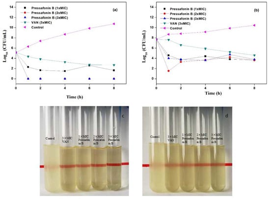 The time−kill kinetics assay of compounds 6 and 7 with different concentrations was carried out against MRSA-3. As shown in Figure 2 and Figure 3, both 6 and 7 showed rapid bactericidal activity. More specifically, the early exponential phase MRSA-3 could be completely eradicated by compound 6 (at 8 μg/mL (2× MIC) and 16 μg/mL (4× MIC); Figure 2a,c) and 7 (at 16 μg/mL (2× MIC) and 24 μg/mL (3× MIC); Figure 3a,c) within 1−2 h, and the growth of the stationary exponential phase MRSA-3 was also effectively prevented by compounds 6 (at 8 μg/mL and 16 μg/mL; Figure 2b,d) and 7 (at 16 μg/mL and 24 μg/mL; Figure 3b,d), respectively.