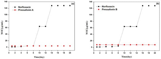 According to the methods used in previous studies [], the propensity for developing bacterial resistance towards S. aureus (ATCC 29213) of compounds 6, 7 and control antibiotic norfloxacin was investigated. Briefly, the original MICs of compounds 6, 7 and norfloxacin against S. aureus were determined at first. An S. aureus suspension incubated at the exponential phase at 37 °C was passaged to a fresh MHB containing the test compounds at sub-inhibitory concentration (1/2 MIC), the process was repeated every 20 to 22 h for up to 20 passages, and the MICs for test compounds were assayed at every passage as described above.