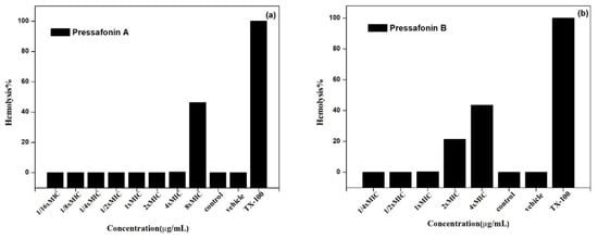 Red blood cells (RBCs), isolated from the fresh sterile sheep blood, were resuspended in 1× PBS (5%). A RBCs suspension (150 μL) was then added to solutions of serially diluted compounds 6 and 7 at the different concentrations (compound 6 for 1/16×, 1/8×, 1/4×, 1/2×, 1×, 2×, 4×, 8× MIC; compound 7 for 1/4×, 1/2×, 1×, 2×, 4× MIC) in a 96-well plate (50 μL). Triton X-100 (1%) was used as a positive control. The plate was incubated for 1 h at 37 °C and centrifuged at 3500× g rpm for 5 min. The supernatant (100 μL) was transferred to a fresh 96-well plate. The results are shown as the percentage of hemolysis according to the absorbance measured at 540 nm [].