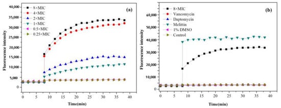 In order to explore whether the bactericidal effect of active compounds acts directly on the cell membrane, compound 7 was selected to further investigate the mode of antimicrobial action. Experiments of the SYTOX green assay indicated that when an MRSA-3 bacterial suspension was exposed to 1×, 2×, 4× and 8× MIC of compound 7, it increased the SYTOX green fluorescence emission gradually after 8 min (Figure 6a). In addition, when the concentration of compound 7 was 8× MIC, the fluorescence intensity was close to that of the positive control melittin (Figure 6b), while the blank, vancomycin and daptomycin failed to increase the fluorescence intensity under the same conditions. These observations confirmed that compound 7 rapidly disrupted bacterial membranes.