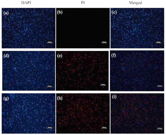 Fluorescence microscopy graphs of DAPI/PI staining of MRSA-3 treated with 2-fold and 4-fold MICs of 7. (a–c) Non-treated with 7 (black control); (d–f) treated with 7 at 2× MIC; (g–i) treated with 7 at 4× MIC (scale bar 200 μm).