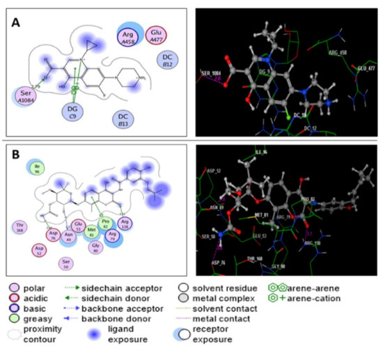 (A,B) diagram illustrate 2D and 3D binding patterns of the co-crystallized ligands ciprofloxacin and novobiocin within the ATP-active pocket of S. aureus DNA gyrase (PDB code: 2XCT) and topoisomerase IV (PDB code: 4URN), respectively. (Hydrogen bonds are illustrated as dashed lines; C atoms are colored gray, N blue and O red.)