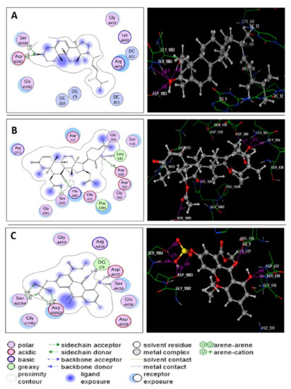 Through detailed analysis of the acquired docking data, it was clear that ergosterol, helvolic acid, and monomethyl sulochrin-4-sulphate were fitted within the ATP-active site of S. aureus DNA gyrase with energy scores ranging from −7.40 to −8.83 kcal/mol (Table 5). Ergosterol displayed four H-bond acceptors between the hydroxyl oxygen and the sidechains of Asp1083 and Ser1084 (distance: 2.76, 2.78, 2.82 and 3.13 A°, respectively) (Figure 4A). Helvolic acid exhibited three hydrogen bonds between the hydroxyl group and the amino acids Asp508, Leu583 and Gly584 (distance: 3.38, 2.47 and 2.89 A°, respectively). Another two hydrogen bond acceptors appeared between oxygens of the carbonyl group at p-7 and acetoxy group at p-6, with the sidechains of His1081 and Ser1085 (distance: 2.70 and 2.72 A°, respectively) (Figure 4B). On the other hand, monomethylsulochrin-4-sulphate formed three H-bond acceptors between the oxygens of hydroxyl and carbonyl groups linked to the benzoyl moiety with Asp437, Ser438 and DG9 (distance: 2.65, 2.48 and 2.38 A°, respectively). Also, the sulfate group shared binding by forming five H-bonds with the sidechains of Asp1083 and Ser1084 (distance: 2.99, 3.46, 2.54, 2.85 and 3.02 A°, respectively) (Figure 4C).