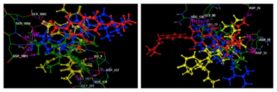 A docking simulation study of the three most active metabolites was performed to explain the observed promising potencies of the fungal extract against S. aureus DNA gyrase and topoisomerase IV and to explore the possible binding modes and interactions of these ligands within the active sites of both enzymes. First, the energy minimized ligands, ciprofloxacin and novobiocin, were re-docked in the active site of S. aureus DNA gyrase and topoisomerase IV (Figure 3A,B). Ciprofloxacin and novobiocin revealed energy scores of −7.22 and −7.60 kcal/mol at root mean square deviation (RMDS) values equal to 0.90 and 1.26, respectively. Furthermore, the isolated active compounds, ergosterol, helvolic acid and monomethyl sulochrin-4-sulphate, were docked into the ATP-active sites of S. aureus DNA gyrase (Figure 4A–C) and topoisomerase IV (Figure 5A–C), and the obtained docking data are recorded in Table 5 and Table 6.