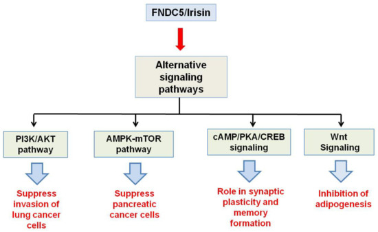 Major functions which the fndc5/irisin gene elicits in the body are mediated by p38 and ERK1/2 signaling. WAT browning is induced by irisin through p38 and ERK. It was shown both in vivo and in vitro that recombinant irisin treatment increases levels of phosphorylated p38 as well as phosphorylated ERK, which in turn results in the upregulation of the UCP1 expression level [29]. Irisin through p38 MAPK and ERK1/2 signaling is not only responsible for the browning of WAT but also induces neural cell differentiation, osteocyte proliferation, glucose uptake by the muscles, and a reduction in insulin resistance [30]. The main physiological effects which irisin shows through MAPK signaling pathways are depicted in Figure 2. AMPK and PI3K/AKT pathways mediate the effect of irisin in proliferation, anti-inflammatory, and anti-metastatic activities. A report showed that irisin enhances the proliferation of H19-7 cells through STAT3 signaling instead of AMPK and/or ERK, so it can be inferred that irisin exerts its neuroprotective effect partly through STAT3 signaling [30]. It was demonstrated that irisin treatment activates the AMPK pathway and downregulates the mTOR pathway, thereby suppressing pancreatic cancer cell growth, and thus inhibits the epithelial–mesenchyme transition (EMT) of pancreatic cancer cells [31]. Irisin has also been shown to mediate its effect through the PI3/AKT pathway in lung cancers. A study showed that irisin can reduce the expression of the EMT marker and inhibits the Snail expression via PI3K/AKT pathway, thereby inhibiting the invasion, migration, and proliferation of lung cancer cells [32]. Irisin has also been found to stimulate the cAMP/PKA/CREB pathway, thereby regulating neuronal plasticity and preventing memory impairment [33]. It was demonstrated that irisin can inhibit adipogenesis through activation of the Wnt expression and following the repression of transcription factors [34]. In Figure 3, the role of irisin has been shown in different physiological conditions through pathways other than MAPK signaling.