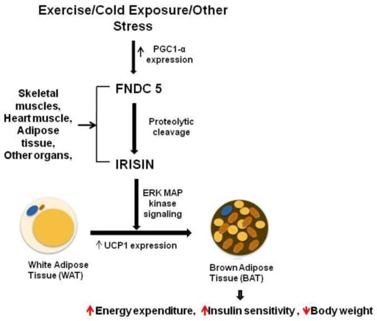 Irisin is mainly secreted from skeletal muscles. However, immunohistochemical studies have shown that it is also found in the pancreas, testes, liver, and stomach [4]. Irisin secretion and synthesis are induced by exercise and PGC1α [13]. PGC1-α is a multispecific coactivator of transcription, which is competent in multiple gene regulation in response to the nutritional and the physiological signals in tissues such as brown adipose tissue, skeletal muscle, and heart and liver tissue [14]. As irisin is an exercise-induced myokine, the circulating level of irisin increases in individuals engaged in exercise-induced activities and progressively decreases in those who are sedentary and less active [15]. Prolonged exercise increases PGC1α expression mainly in the skeletal muscles and heart and improves various metabolic parameters, including AMPK activation, PGC1α phosphorylation, insulin sensitivity and signaling, and FNDC5 production, followed by the cleavage of FNDC5 to secrete irisin [15,16].