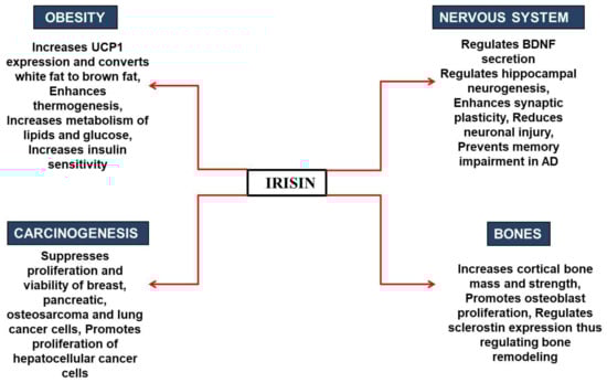 We reviewed the function of irisin in different tissues. It was suggested that irisin is involved in various diseases such as obesity, type 2 diabetes, osteoporosis, cerebral ischemia, and Alzheimer’s disease. Moreover, it was observed that irisin is also associated with some cancers such as breast cancer, pancreatic cancer, and prostate cancer. It has been known for a long time that physical exercise improves quality of life and can lower the risk of several diseases. The discovery of irisin in 2012 by Bostrom et al. was a breakthrough and demonstrated that irisin is a molecular mimic of exercise. It was revealed for the first time that irisin can elicit beneficial effects of exercise at the molecular level. The main function of irisin has been shown to promote the browning of white adipocytes. The other beneficial physiological effects exerted by irisin include anti-inflammatory properties and associated anti-metastatic effects, neuroprotective effects, and mitigation of oxidative stress [30]. Although various signaling pathways have been elucidated in order to know the action of irisin in pathological conditions, much work is needed to determine its reception mechanism and mode of action in different tissues. Despite the need for further research, irisin remains an interesting molecule from a pathophysiological point of view and is a potential therapeutic target for various metabolic diseases. Since irisin is a multifunctional protein and has beneficial health effects, there is a need for more research to investigate and test the therapeutic applications of this important myokine.