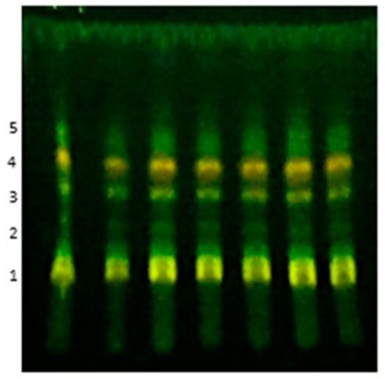 Thin-layer Chromatography from seven batches of aqueous extract of M. chamissois Naudin (AEMC). Each column represents one extraction batch. The leaves were collected in May 2017. The stationary phase was silica gel, and the mobile phase was a mixture of ethyl acetate, formic acid, acetic acid, and deionized water (100:11:11:26). Chromatographic spots were visualized using an ultraviolet lamp at 254 nm and the NP/PEG reagent. 1: Rf 0.17, 2: Rf 0.33, 3: Rf 0.43, 4: Rf 0.54 and 5: Rf 0.61.