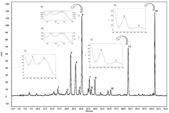 Chromatographic profile of aqueous extract M. chamissois Naudin leaves (B4) by HPLC/DAD at 354 nm. Detection at 354 nm, C18 column, flow rate of 0.6 mL/min, eluent: phosphoric acid 1%, and acetonitrile in gradient system. (A) similarity of peak 6 (tR 24.89 min, λmax: 270, 336) and vitexin standard compound (similarity index: 0.9959); (B) similarity of peak 6 (tR 24.89 min) and isovitexin standard compound (similarity index: 0.9951), (C) peak 6 (tR 24.89 min, λmax: 270, 336); strongly suggestive a vitexin or isovitexin related compound (D) peak 11 (tR 41.27 min; λmax: 282, 363) miconioside B; (E) peak 12 (tR 50.76 min; λmax: 282, 363) matteucinol-7-O-β-apiofuranosyl (1 → 6)-β-glucopyranoside.