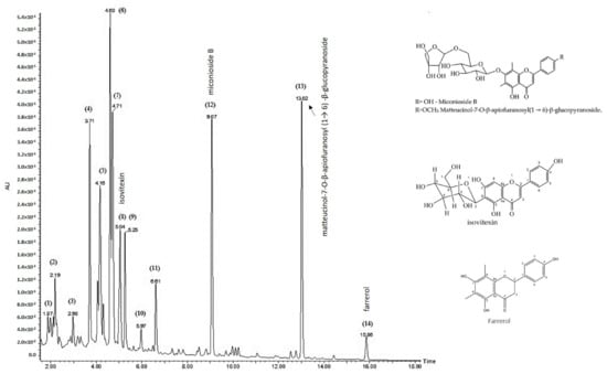 In addition, peaks 11 and 12 showed a flavanone profile, suggesting the presence of miconioside B (tR 41.36 min) and matteucinol-7-O-β-apiofuranosyl(1 → 6)-β-glucopyranoside (tR 50.76 min), respectively (Figure 2D,E). These compounds were also identified in M. chamissois by Silva et al. (2020) and Gimenez et al. (2020) [7,14].
