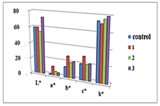Figure 1. Color indicators of sponge cake crust with elderberry blossom flour (Sambucus nigra L.).