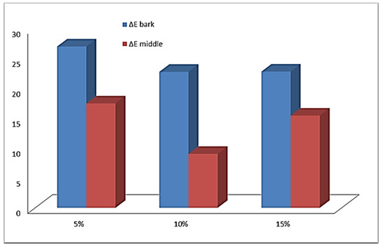 When controlling the quality of sponge cake layers, one of the main criteria is lightness. For baked and fried products, it is known that dark brown color is not preferred by consumers [23]. The use of 5% and 10% dried elderberry blossom flour resulted in the preservation of the lightness of the crust and middle part as that of the control. Maximum values for the indicator “L” for crust and middle part were recorded in the sponge cake layer with 15% Sambucus nigra L. Therefore, 15% dried elderberry blossom flour had the greatest darkening compared to the control. High values of b (yellow component) and values of a > 2 (red component) indicate a significantly bright and intense orange–brown color [24]. The color difference of the bark between the control and the tested samples shows that in the products containing Sambucus nigra L. it remains practically the same. There was an increase in color difference only for the center of the sponge cake blotch with 15% dry flower meal of Sambucus nigra L. (Figure 3). Therefore, the addition of Sambucus nigra L. flower flour above 10% can lead to effective color change during roasting. Similar results in the literature have been reported for chia oil powder supplementation [25]. A good correlation was found between bark lightness and moisture content in the pandishpan bogs. It is known from the technology that the Maillard reaction and caramelization processes are significantly dependent on moisture content; a similar finding was reported by [26] for fried sweet potatoes and by [27] for products fried by Air Frying technology.