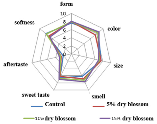 For the indications ‘color’, ‘smell’, and ‘sweet taste’, the sensory evaluators gave the highest scores for the sample with 15% Sambucus nigra L. (Figure 4). The values for the indicator ‘shape’ of the sponge cakes were high. Therefore, the addition of Sambucus nigra L. dried blossom flour does not adversely affect the shape of the newly developed products. That is also confirmed by the physicochemical data of sponge cake layers (Table 2) for the layer volume parameter. Sponge cake layers with concentrations of 10% and 15% Sambucus nigra L. flour in the tested samples had the highest values for the “shape” parameter, regardless of the added fibers. Tasters gave the highest marks for the size and uniformity of the sponge cakes with 5% and 10% dried Sambucus nigra L. blossom flour. With the greatest middle part softness, equal in value to the control, was the sponge cake layer with 10% elderberry blossom flour.