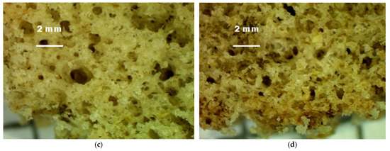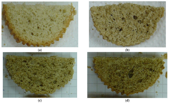 Figure 5. Photo of investigated sponge cakes in the crumb. (a) Crumb of Control sample. (b) Crumb of Option 1. (c) Crumb of Option 2. (d) Crumb of Option 3.