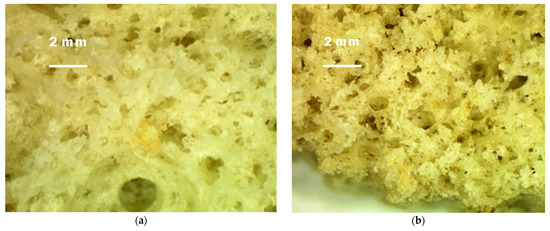 The middle part of the baked sponge cake layers was observed with an Olympus SZ 61 stereomicroscope, Olympus ltd., Tokio, Japan, operating in the bright field with reflected light at 70× objective and 8× eyepiece magnification. The photos were taken with a 5Mp× Wi-fi camera.