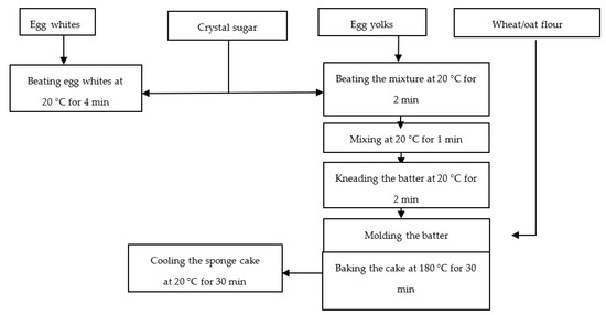 In order to produce sponge cake dough, the following materials were provided by some of the big retail chains in Bulgaria: wheat flour “Extra” (type 500)—manufactured by “Sofia MEL” JSC, Sofia, hen eggs, sugar (crystal, refined); and wholegrain oat flour—manufactured by “Ecosem Bulgaria” Ltd., Stambolovo village.