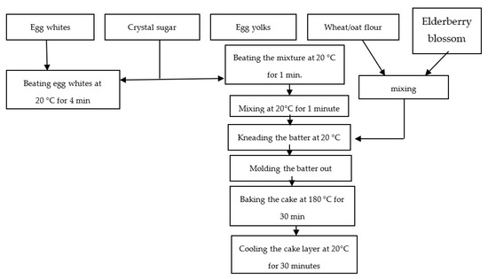 Figure 8. Technological scheme for the preparation of sponge cakes with the addition of Sambucus nigra L. flour (5, 10, and 15%).