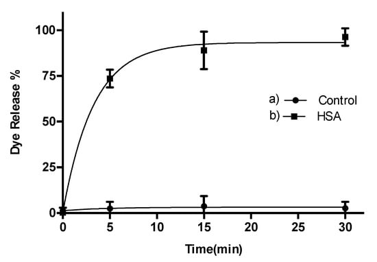 After characterization, the cargo-controlled release studies in the absence and in the presence of HSA were carried out. In a typical experiment, solid S1 (0.5 mg) was suspended in PBS (pH 7.4)-acetonitrile 95:5 v/v (1 mL) in the absence and in the presence of HSA (1000 μg mL−1). At selected times (0, 5, 15, 30 min) aliquots (120 μL) were collected and the supernatant was separated using a 0.22 μm filter. Then, rhodamine B emission at 571 nm (λex = 555 nm) in the supernatant was measured. The obtained kinetic release profiles of rhodamine B from S1 in the absence and in the presence of HSA are shown in Figure 2. As could be seen, in the absence of HSA a nearly zero release of rhodamine B was observed due to an efficient pore closure as a result of strong electrostatic interactions between the grafted positively charged aminopropyl moieties and the anionic curcumin. In a clear contrast, a marked rhodamine B release was observed (ca. 75% of the maximum amount of delivered fluorophore after 5 min) in the presence of HSA, which was ascribed to pore opening due to the formation of a complex between the HSA and curcumin (the logarithm of the stability constant for the HSA-curcumin complex is 4.74) [39].